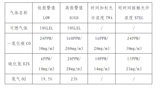 常規(guī)四合一氣體檢測儀常規(guī)氣體報警值設(shè)置標(biāo)準(zhǔn)值如圖: