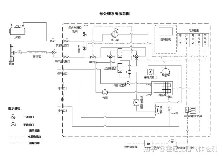 系統帶采樣管高壓氣體反吹功能,通過檢測儀控制電磁閥控制氣路切換,向采樣管中反吹壓縮氣體,以保證采樣管路暢通無堵塞。